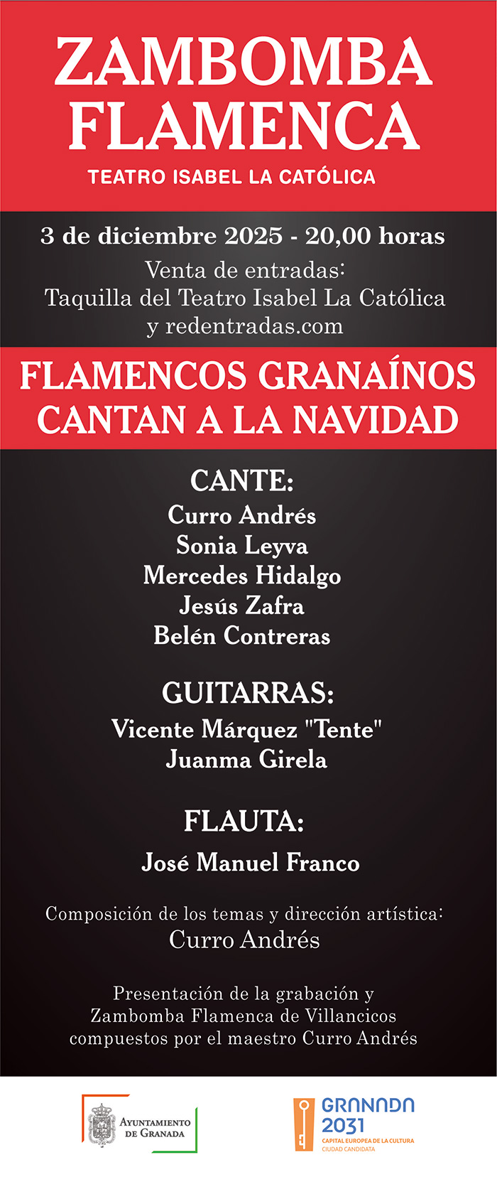 “Flamencos Granaínos cantan a la Navidad” es un proyecto ideado por el veterano cantaor Curro Andrés para rescatar, actualizar y grabar villancicos de diversa procedencia y evitar así su desaparición del cancionero popular granadino. En esta Zambomba Flamenca se presenta su última grabación discográfica y para ello cuenta con un grupo de contrastados artistas flamencos, jóvenes y de gran calidad artística. Se conforma así un espectáculo navideño con una elegante e impactante puesta en escena, gracias al nutrido grupo de cantaores y músicos presentes.