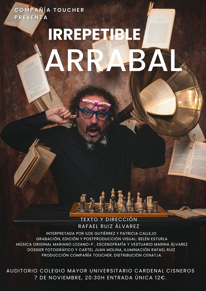 Irrepetible Arrabal pretende ser un homenaje al autor ecléctico y humanista Fernando Arrabal. El montaje está concebido como una biografía fragmentada donde se proyectan a modo de retratos emocionales sus obras teatrales, sus entrevistas, sus películas, sus pinturas... y el juego del ajedrez. Todo ello orquestado en imágenes y música originales en forma de piezas variadas de un sólo puzle donde se integran en aparente confusión las aristas de un mismo personaje llamado a ser inmortal. ¡CONTAREMOS CON LA PRESENCIA DEL PROPIO FERNANDO ARRABAL COMO INVITADO DE HONOR!